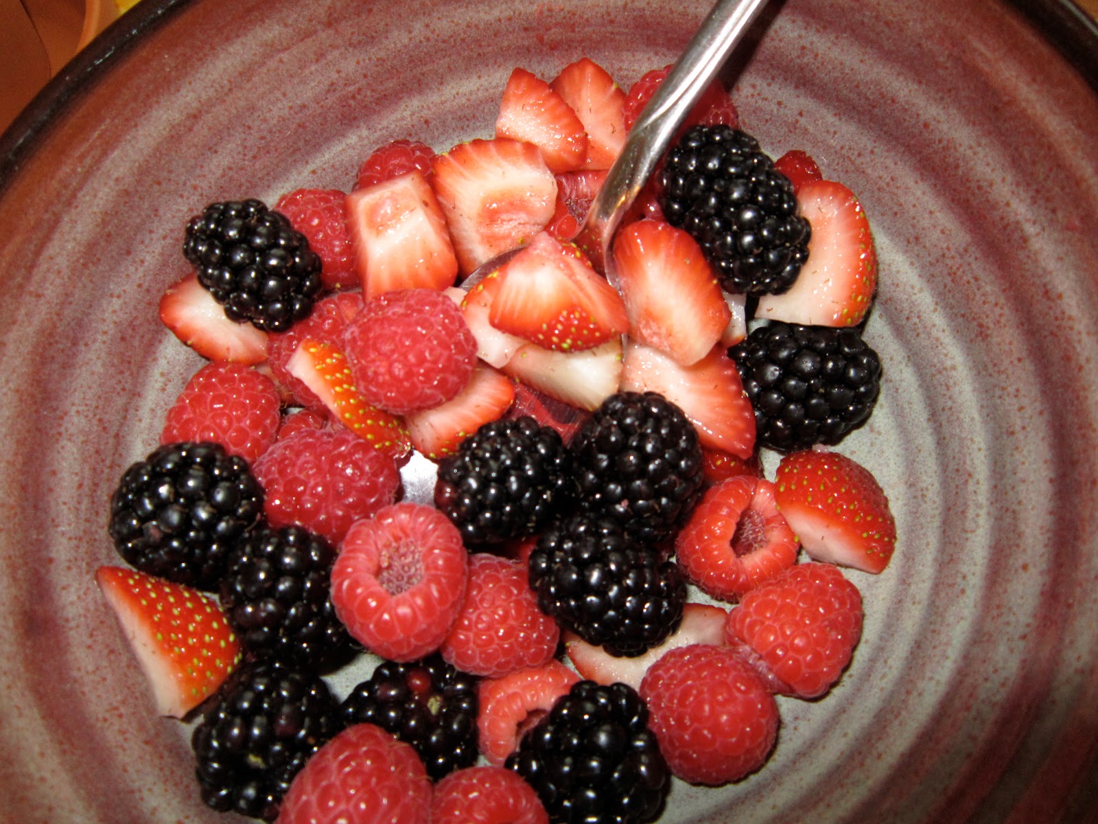 Yummy cracker assortment with dried fruit (raisins this time) and nuts in shot glasses. And mixed berries to round it out. Once in a while I'll scrap the dried fruit and nuts and make berries with yogurt and granola instead.
